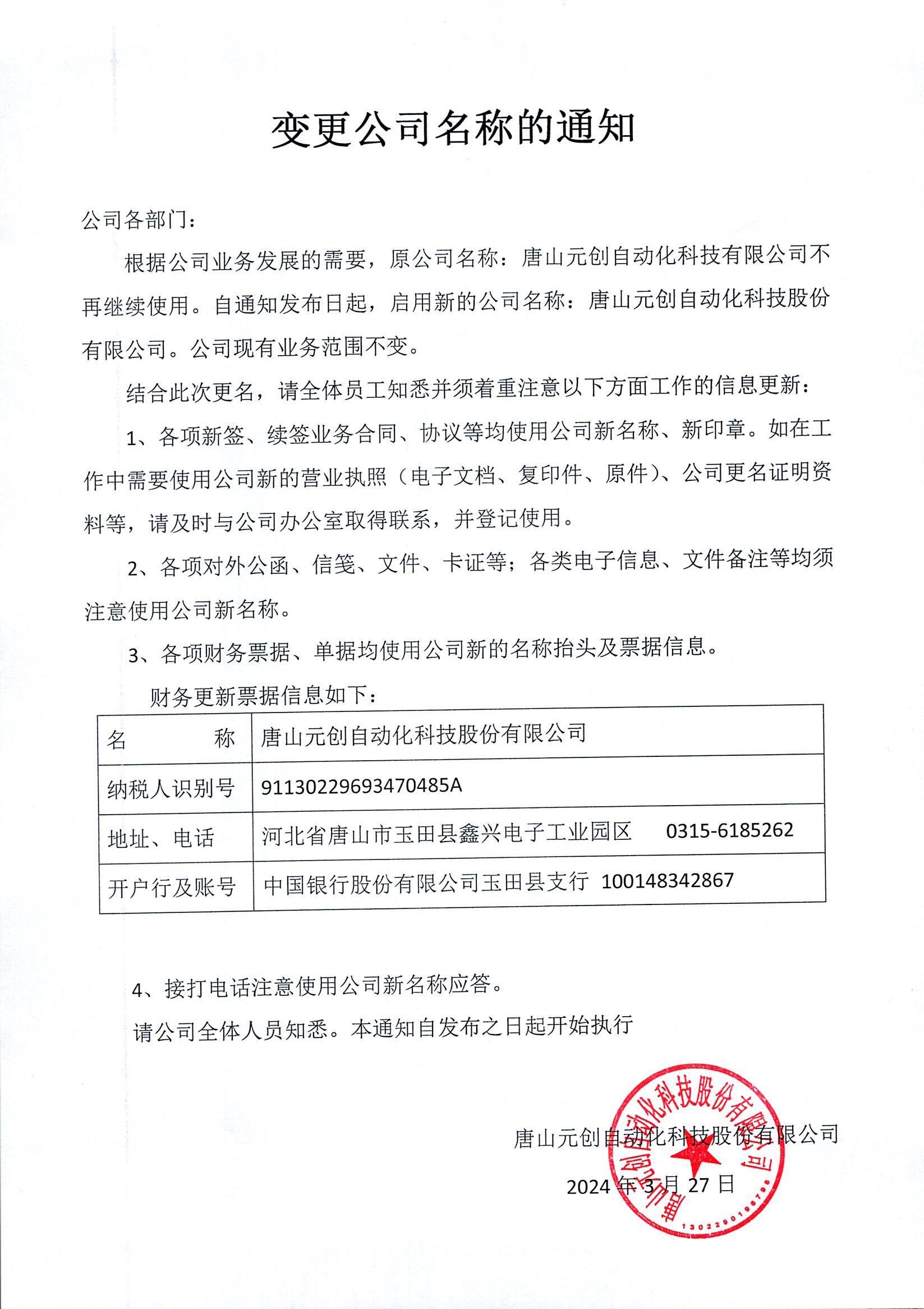 由于公司業(yè)務(wù)發(fā)展的需要,唐山元?jiǎng)?chuàng)自動(dòng)化科技有限公司 現(xiàn)更名為 唐山元?jiǎng)?chuàng)自動(dòng)化科技股份有限公司,公司變更后業(yè)務(wù)主體和法律關(guān)系不變,屆時(shí)原公司的所有業(yè)務(wù)由變更后新公司統(tǒng)一經(jīng)營(yíng),原簽訂的合同繼續(xù)有效,原有的業(yè)務(wù)關(guān)系和服務(wù)承諾保持不變。給您帶來(lái)的不變敬請(qǐng)諒解,衷心感謝您一貫的支持和關(guān)懷,我們將一如既往的和您保持愉快的合作關(guān)系,并希望繼續(xù)得到您的關(guān)心和支持!